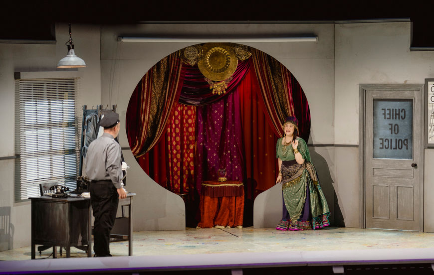"Bek Palmer’s splendid costume designs: the set, incidentally, with its liftable panel revealing all sorts of designs, is also pretty nifty. "